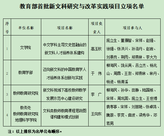 11月,教育部办公厅公布了首批新文科研究与改革实践项目的名单,我校“中文学科主导文史哲融合的新文科人才培养体系建构”等4个项目获批立项。新文科研究与改革实践项目是教育部办公厅为深入学习贯彻习近平新时代中国特色社会主义思想,贯彻落实全国教育大会精神,落实新文科建设工作会议要求,全面推进新文科建设,构建世界水平、中国特色的文科人才培养体系的一项重要举措。这是教育部办公厅首次开展新文科研究与改革实践项目立项工作,最终认定 1011 个新文科研究与改革实践项目。