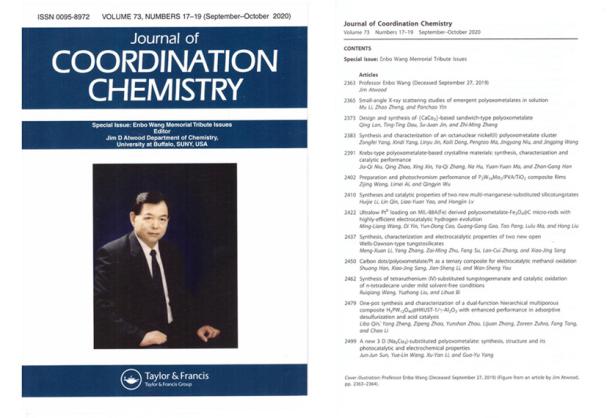 3月,为纪念我校已故荣誉教授王恩波先生在多酸化学和配位化学领域的杰出贡献,国际化学领域著名期刊《配位化学》(Journal of Coordination Chemistry)出版纪念专刊,深切怀念王恩波先生。这期专刊是由《配位化学》杂志主编Jim D Atwood教授组织编写,南京大学孙为银教授、我校李阳光教授和陈维林教授协助完成,该专刊邀请了王恩波先生的国内外同事、学生发表他们在以多酸为主的研究领域中的最新科研成果,集结成刊《Special Issue: Enbo Wang Memorial Tribute Issues》,以此表达对王恩波先生的深切怀念。