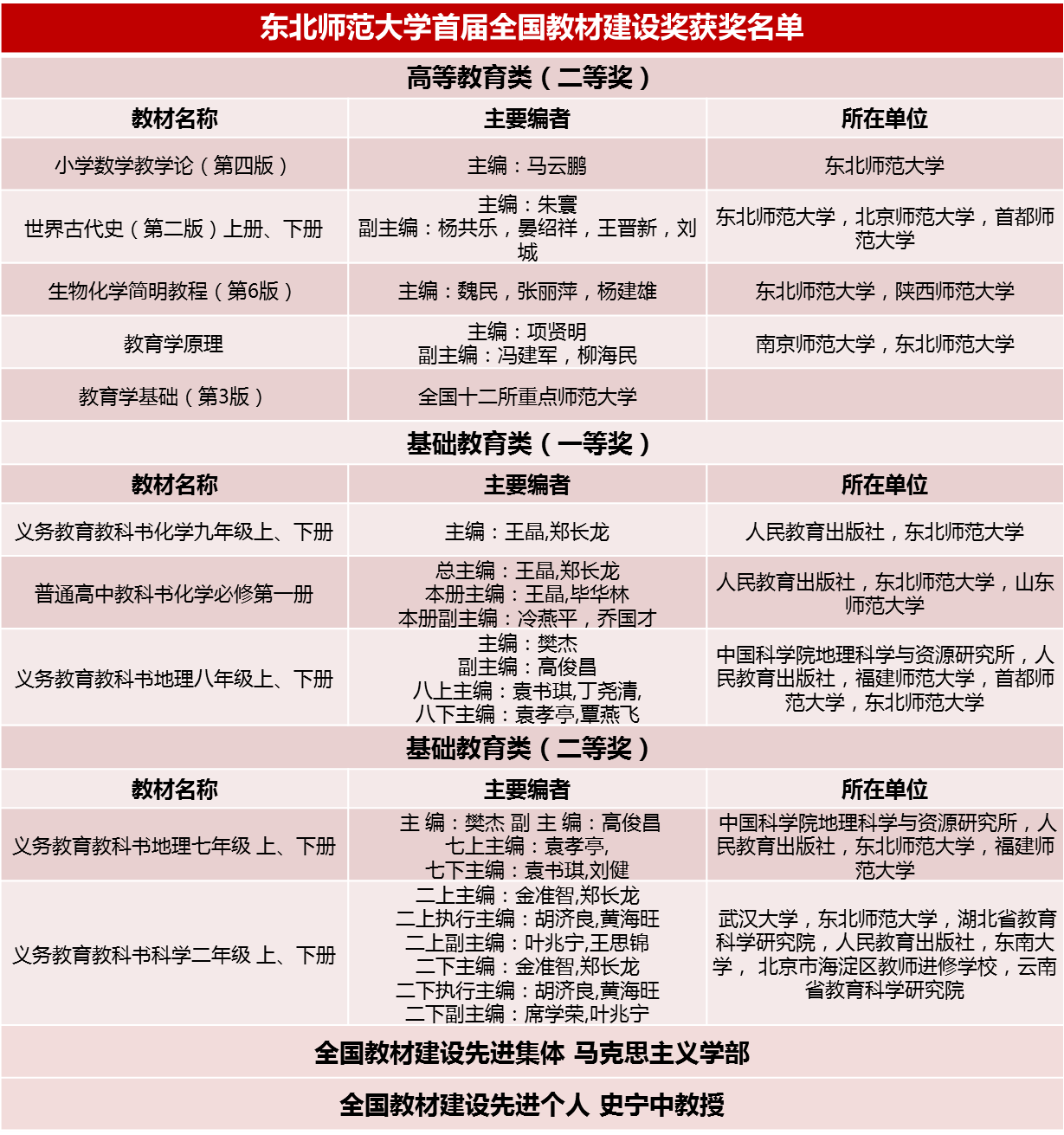 10月,国家教材委员会发布了首届全国教材建设奖奖励决定。我校教师主编或参编的10项教材荣获全国优秀教材奖。高等教育类我校教师主编教材获二等奖3项,我校教师参编教材获二等奖2项;基础教育类我校教师参编教材获一等奖3项,二等奖2项。马克思主义学部荣获“全国教材建设先进集体”称号,史宁中教授荣获“全国教材建设先进个人”称号。全国教材建设奖是我国教材领域的最高奖。该奖由国家教材委员会主办、教育部承办,每四年评选一次,对各级各类优秀教材和做出突出贡献的先进集体、先进个人予以表彰。