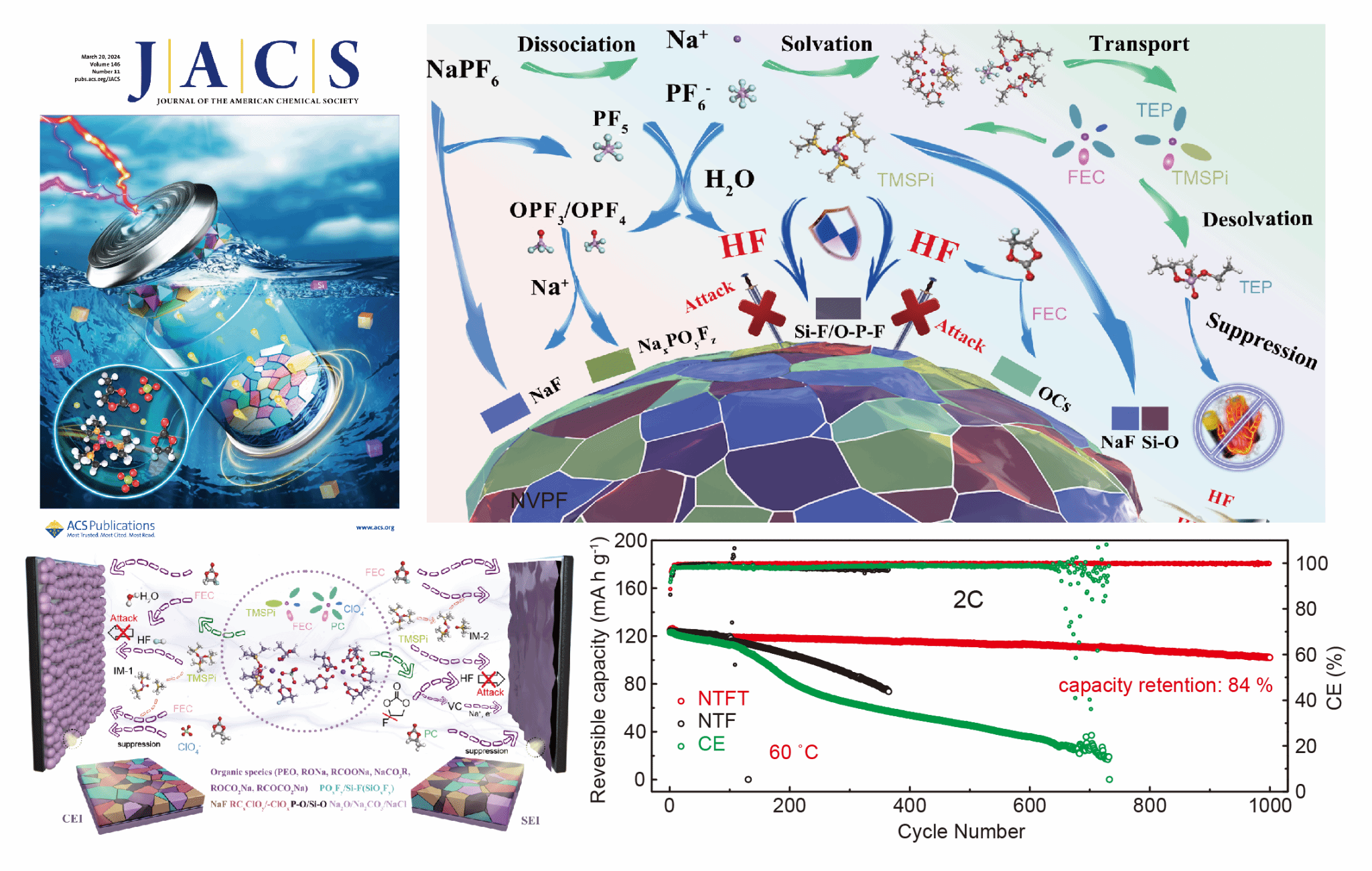 通过设计电解液的添加剂组分、溶剂化结构,稳定电极/电解质界面,提升Na+传输动力学,成功实现了钠离子电池的全天候适应性。开发的宽温区钠离子电池,在−25至75℃跨度100℃的温度范围均可稳定运行:在60℃下循环1000圈后,容量保持率仍然为84%;在75℃下循环300圈,容量保持率达到80%;以Na3V2(PO4)2O2F和硬碳分别为正极和负极组装的全电池,在−25℃和50℃下循环超过500次和1000次,在连续温度变化的全天候动态测试中表现出出色的温度适应性。该成果以“Electrolyte Chemistry toward Ultrawide-Temperature (−25to75℃) Sodium-Ion Batteries Achieved by Phosphorus/Silicon-Synergistic Interphase Manipulation”、“Self-Purification and Silicon-Rich Interphase Achieves High-Temperature (70°C) Sodium-Ion Batteries with Nonflammable Electrolyte”为题,分别发表于国际著名期刊Journal of the American Chemical Society(2024, 146, 7295–7304;被选为封面文章)和Energy Storage Materials(2024, 66, 103230),两篇论文的第一作者为物理学院博士研究生梁皓杰。