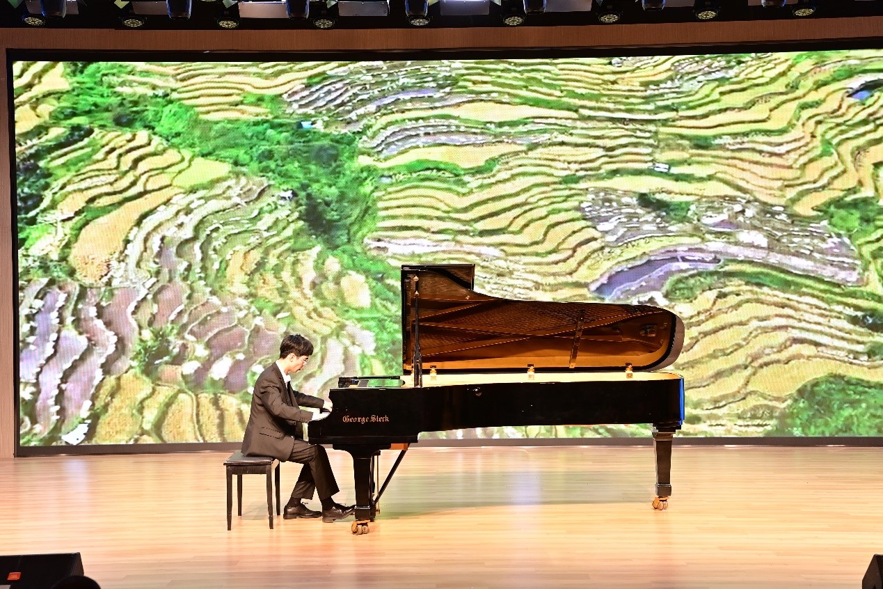 音乐会以钢琴独奏《努玛阿美》拉开序幕,各民族师生通过歌唱、舞蹈、朗诵、钢琴演奏等多种艺术形式,生动诠释中国传统文化,展现中华民族多元一体的文化魅力。先后表演了声乐演唱《祖国,慈祥的母亲》、独舞《山的那边》、钢琴演奏《四手联弹——牧歌》、声乐演唱《我爱你中国》、钢琴独奏《音诗》、声乐演唱《阿里郎组曲》、群舞《芳刀寒梅》,还邀请到附属小学学生表演群舞《少年志》。演员们用民族诗歌编织成跳动的音符,用民族文化演绎为动人的歌声,传递和表达了各族人民对祖国的热爱和民族团结之情。音乐会在朗诵与合唱《我和我的祖国》中落下帷幕。