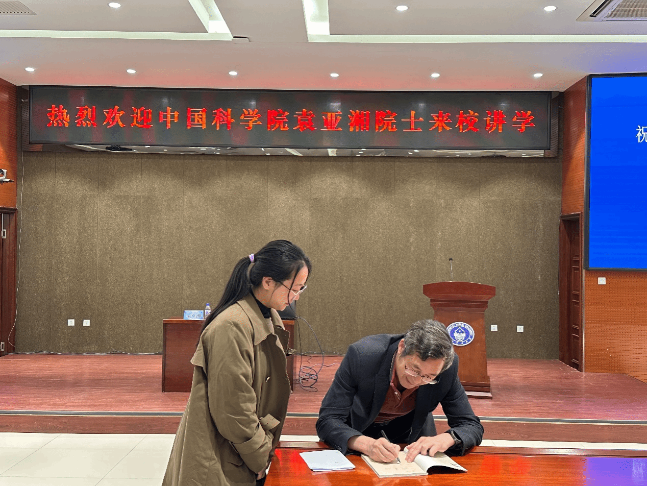 在互动环节,袁亚湘与在场师生进行了热烈交流,他耐心地回答了现场学生提出的学术困惑,为师生提供了宝贵的前沿知识和信息,并将带有自己亲笔签名及赠语的《数学漫谈》一书赠予提问学生,鼓励学生在数学研究的道路上坚持不懈,继续努力。